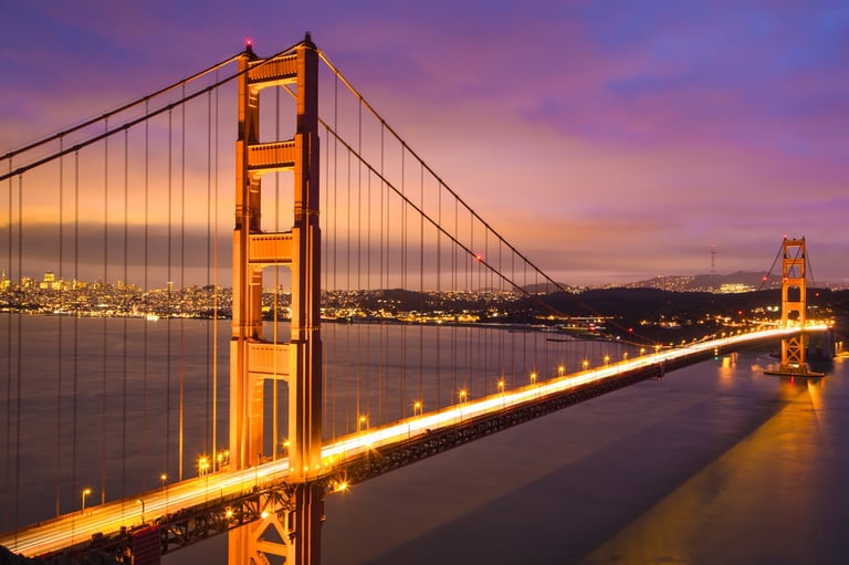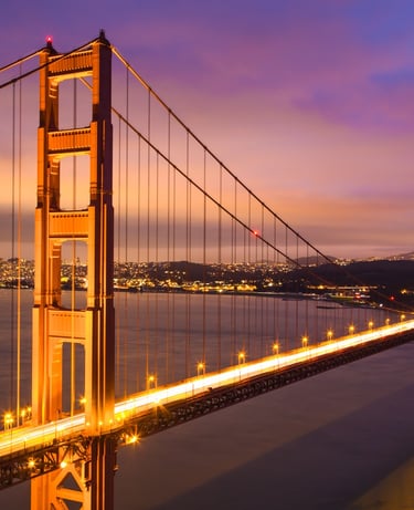 With the ever changing weather patters in the San Francisco bay area I had to seize the opportunity to capture the Golden Gate Bridge. I spent the better part of the afternoon checking all vantage points along the hillside. I wanted to show as much detail across the entire frame. Typically called the blue hour, this is the period of twilight during dusk when the sun is well below the horizon and the residual light takes on a predominantly blue hue. With that and the city lights casting more colors this photo was well worth the wait.